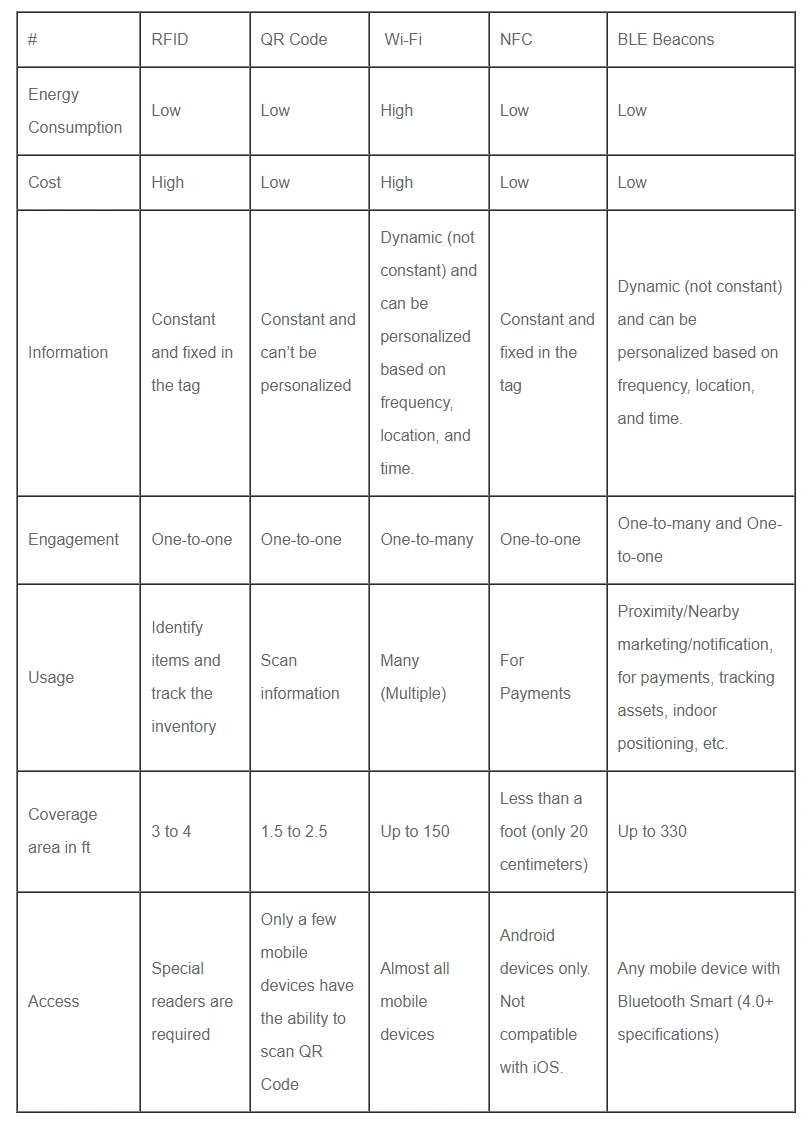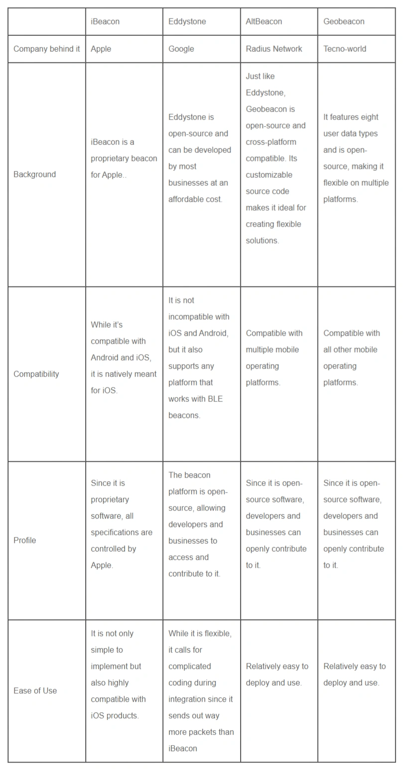 يمكن أن يعمل هذا أيضًا مع التكرارات اللاحقة لنظام التشغيل. يمكن لمعظم تقنيات BLE الأخرى الاتصال بسهولة مع الأنظمة الأساسية الأخرى. بينما لا يزال بإمكان iBeacons الاتصال بنظام Android, وهي مخصصة أصلاً لأجهزة iOS. وهذا يعني أنك لن تتمكن من تحسينه بشكل كامل على منصات الأجهزة المحمولة الأخرى.