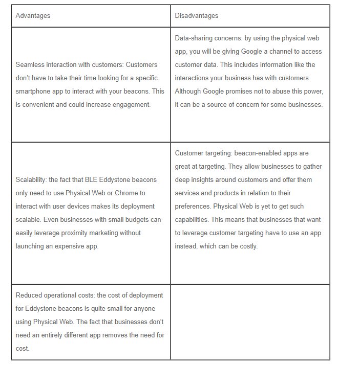 طالما أن الشركة يمكنها تدريب العملاء على كيفية استخدام أداة Google Chrome أو تثبيت تطبيق الويب المادي, يمكنهم الاستمتاع بامتيازات Eddystone-URL. يتيح لهم ذلك تحسين جهودهم التسويقية والمشاركة بشكل أكبر عند محاولة جذب العملاء.