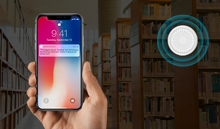 Buscar libros en una biblioteca grande puede ser un desafío. Pero con tecnología de baliza, puede recibir una notificación cada vez que pase por una sección de la biblioteca para conocer el tipo de libros disponibles en esa sección. también, la administración de la biblioteca puede usar la tecnología de balizas para enviar un aviso de las nuevas llegadas a todos los que visitan la biblioteca.