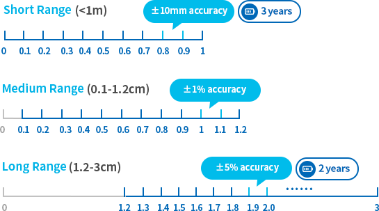 Nosso sensor TOF oferece três modos de medição de distância: curto alcance (<1.2m) com precisão de ±10mm, de médio alcance (0.1m-1,2m) com precisão de ±5%, e longo alcance (1.2m-3m) com precisão de ±1%. Tem uma vida útil de 3 anos no modo de curto alcance e 2 anos no modo de longo alcance, fornecendo medições confiáveis e precisas para diversas aplicações.